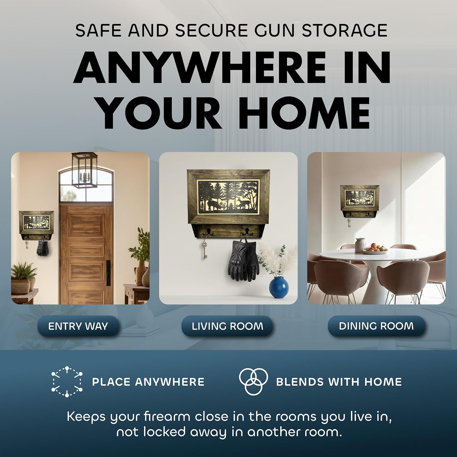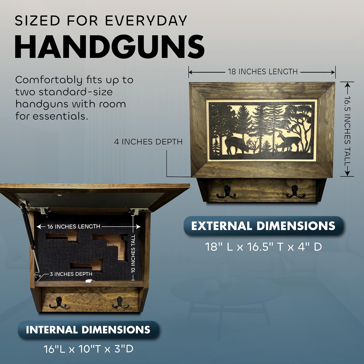 - AMERICAN MADE NATURE INSPIRED DESIGN: Handcrafted in the USA with family-owned care, our Deer Hunter hidden gun shelf is constructed for long-term durability and a refined finish suited for home décor. It provides decorative wall art with discreet firearm storage that enhances any room.
