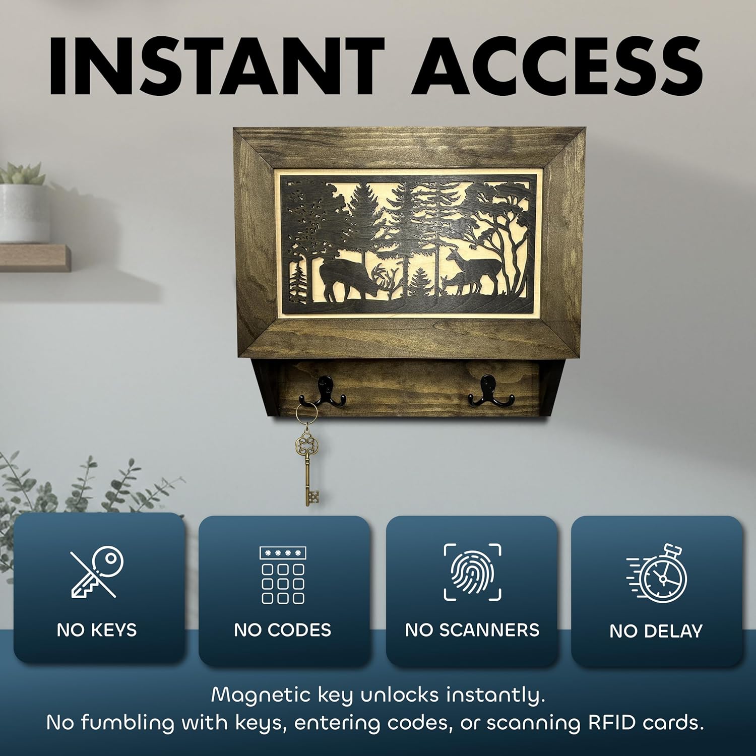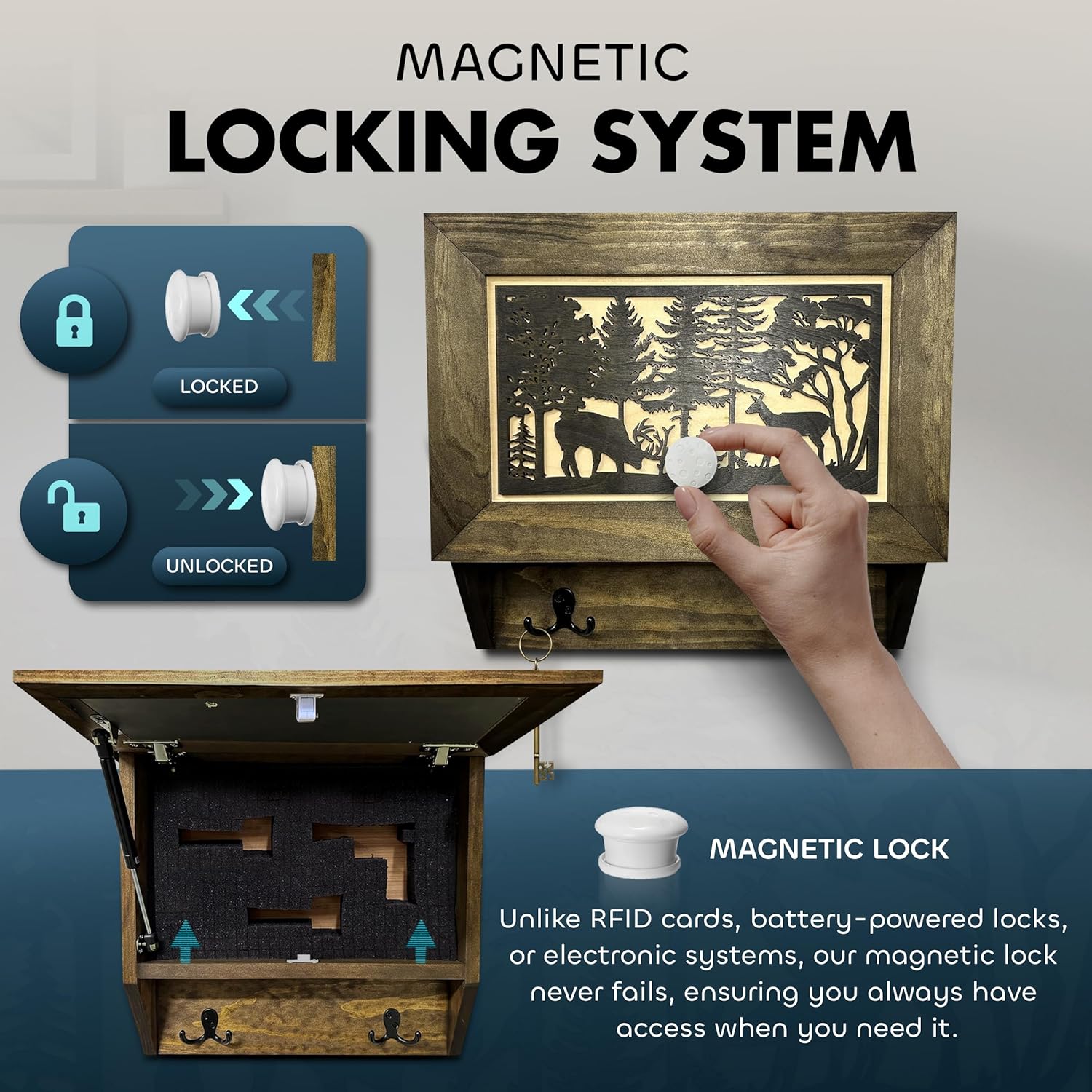 Gun Concealment Furniture - Deer Hunter Coat Rack Hidden Wall Safe with Hooks for Coats, Bags, & Hats - Quick Access Hidden Gun Storage - Wood Gun Cabinet with Secure Magnetic Lock