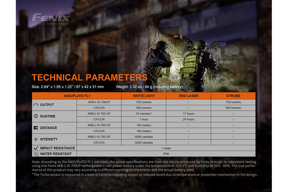 The Fenix GL22 is a multifaceted tactical light designed for rail-equipped hardware. With a ARB-L16-700UP Li-ion battery, it provides up to 17 hours of runtime. It can also use CR123A batteries. Navigating the white light and red laser is easy, thanks to the ambidextrous switches with a momentary-on feature. The powerful Luminus SST20 LED produces 750 lumens, and it fits many Glock and MIL-STD-1913 Picatinny rail systems, like the Glock 36 with standard rail and Springfield XDs. This must-have tactical light from Fenix is perfect for any enthusiast.