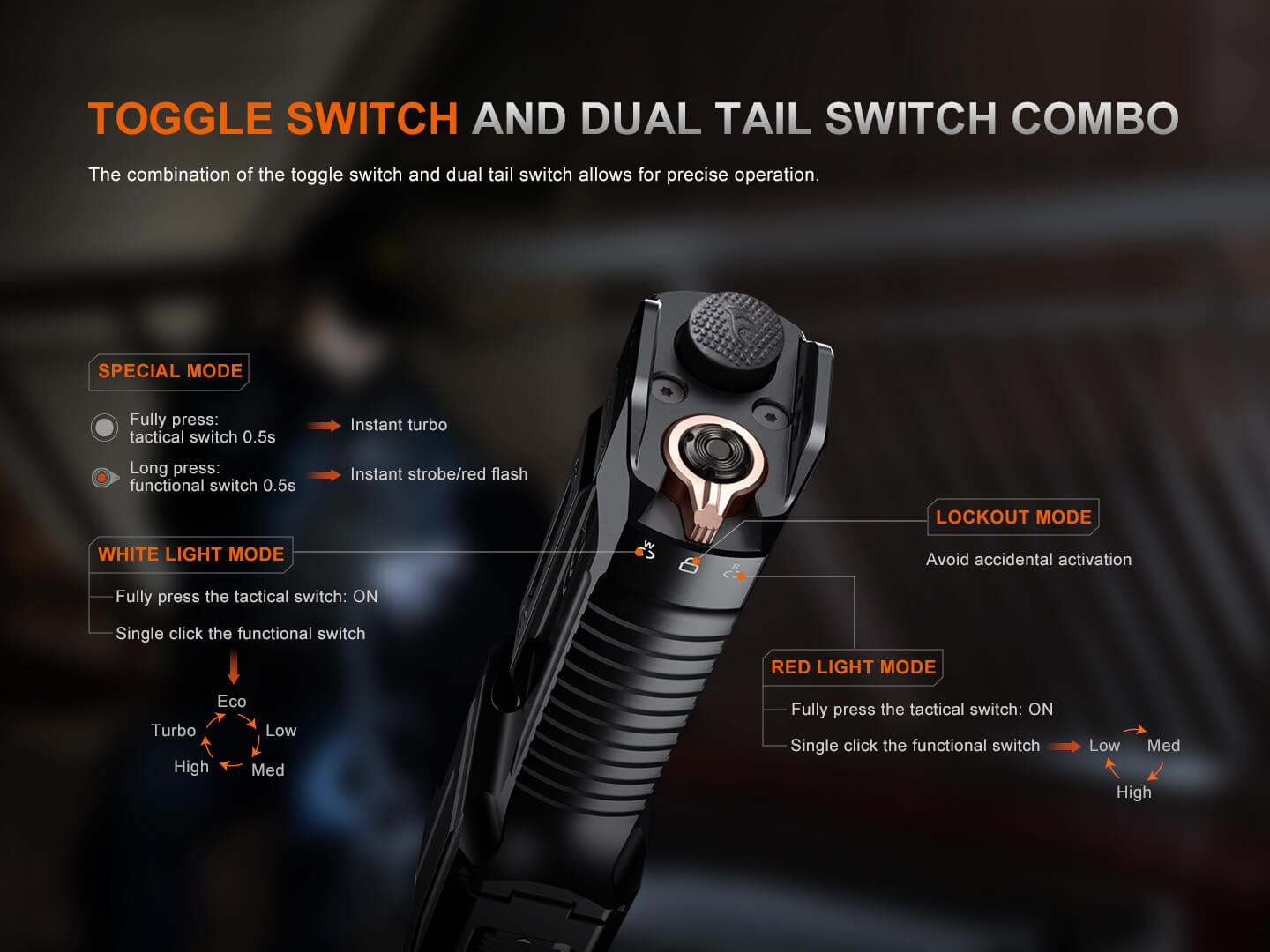 The Fenix TK28R Multi-LED High-Performance Flashlight packs a powerful 6500-lumen output with both spotlight and flood lights combined into one, plus a 260-lumen red light for night vision protection and signaling. Its toggle switch and dual tail switches provide fast, intuitive control, including instant strobe and instant turbo for rapid response in critical situations.