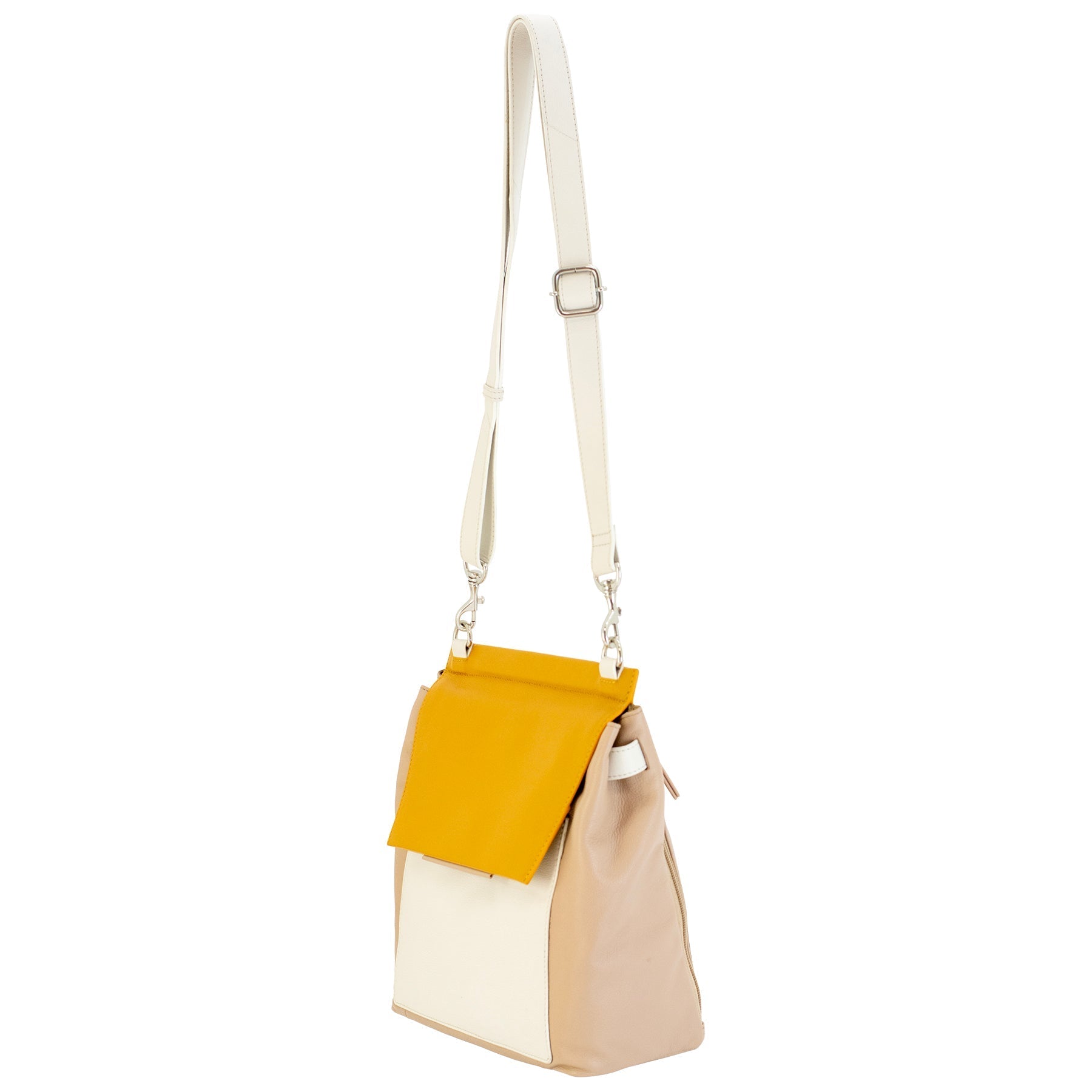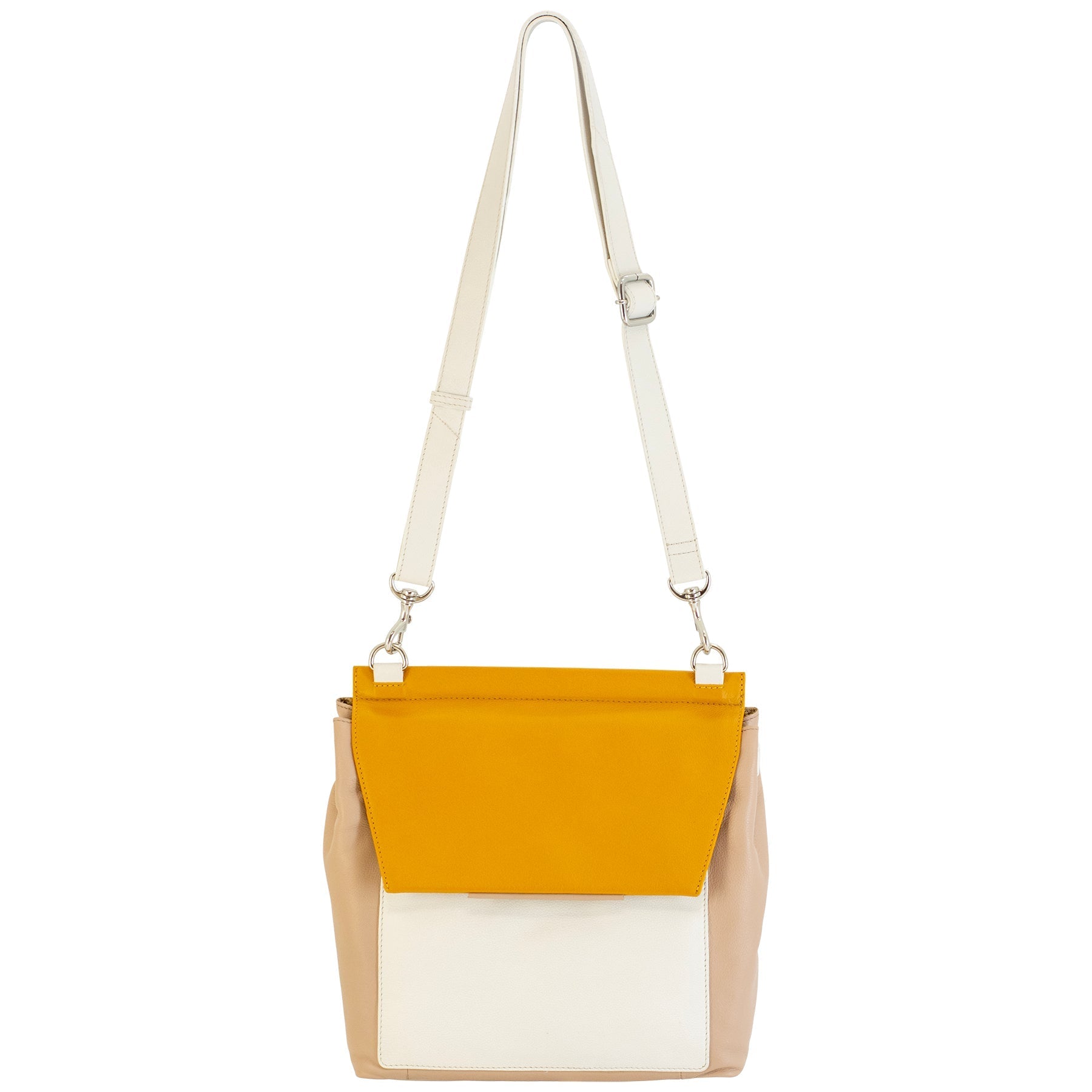 This medium-sized envelope crossbody bag is a combination of convenience and charm, masterfully crafted from soft leather in striking shades of yellow, beige, and white. The bag's exterior palette brings a pop of color to any outfit, with its multi-shaded design creating a unique pattern that stands out in the crowd.